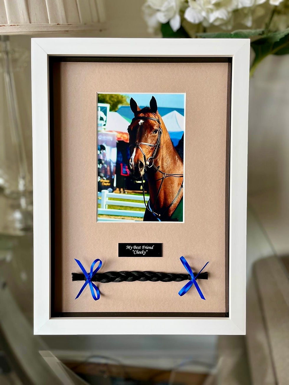 A lock of your horse's precious hair, braided and mounted with your favourite photo in an elegant box frame with a personalised engraved plaque.